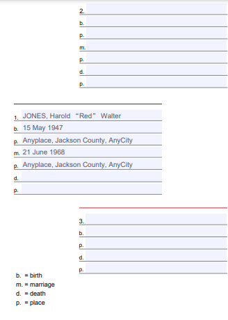 - Write surnames in capital letters to distinguish last names from first and middle names. Always list last name first when recording names. Do not abbreviate names and record nicknames in quotation marks. (ie JONES, Harold “Red” Walter). If you know the middle name, spell it out as the person may have gone by their middle name when they were living and would help you when you are searching census records or newspaper articles. Record names by entering the full name: last, first, and middle.